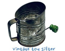 Vintage Childs Toy 1 Cup Tin Metal Flour Sifter w/GREEN Knob Handle U.S.A.