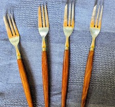 4 Vintage Mid Century Dutch Stainless Pastry Forks Canoe Muffin Teak Wood Handle
