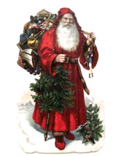 Large Vintage Father Christmas Die Cut w/ Tree & Lots of Toys in His Bag *
