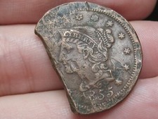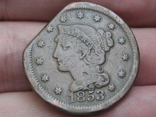 1843-1857 Braided Hair Large Cent Penny, Clipped Planchet, Shipwreck Effect