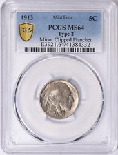 1913 Buffalo Nickel Type 2 PCGS MS-64 Minor Clipped Planchet Mint Error Clip
