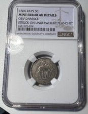 1866 Shield Nickel Error Underweight Planchet NGC Certified AU