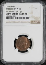 1982-D Jefferson 5C Struck on 1C Copper Planchet (3.1 g) NGC MS-65 ERROR