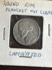 US Nickel 5c Error Round Rim Planchet Not Clear Laminated, 1952