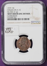 1979 Jefferson Nickel. Mint Error-Struck on 1C Planchet. In NGC Holder. k290