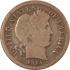 1913 US Barber Dime 90% Silver G Good Free Shipping