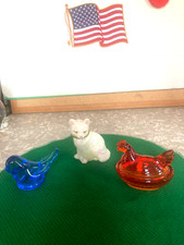 FENTON ANIMAL COLLECTIBLES GLASS BLUE BIRD CAT HEN & NEST