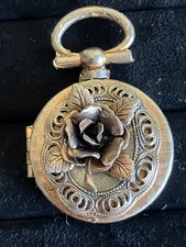 VINTAGE GOLD TONE ROUND LOCKET PENDANT 3D ROSE FLORAL DESIGN POCKET WATCH STYLE