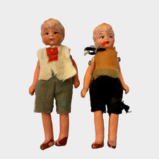 Vintage Boy & Girl Bisque & Cloth Dollhouse Dolls with Metal Stands