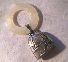 Vintage 1937 Baby Teething Toy Ring Rattler Mother Of Pearl Sterling Silver Bell