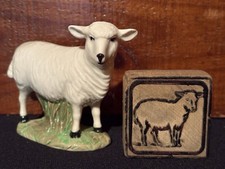 Vintage Primitive Pastoral Ceramic Lamb Sheep & Antique Toy Wood Block AAFA