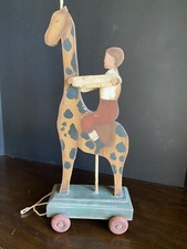 Vintage Giraffe on Wheels Folk Art Polychrome Wood Rolling Toy w/Rider