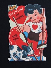 Vintage Valentines Day Card Die Cut Boy On Stilts Spotted Dog Mid Century C1657