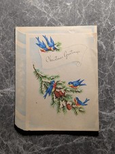 Vintage Christmas Card Bluebirds Snowy Pine Branch Mid Century Art 1940s 1950s