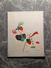 Vintage Christmas Card Snowman Couple Embossed Kitsch Mid Century To Greet You