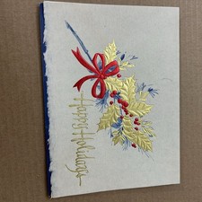 Vintage Mid-Century Christmas Card Gold Foil Holly Leaves Red Now
