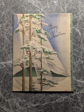 Vintage Christmas Card Mid Century Pine Trees Snowy Mountain Scene Patriotic