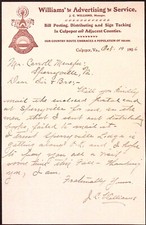 1906 Williams Advertising Service Sign Tacking Bill Posting Culpeper VA Billhead