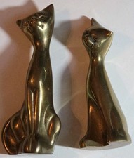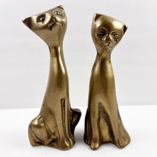 Solid Brass Pair Of Siamese Cat Figurines 6” & 7” High Mid Century Mod Korea