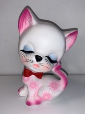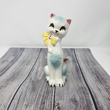 Vintage MCM Kitchsy Ceramic Cat Figurine Mid Century Mod 7” Tall - Pink Flowers