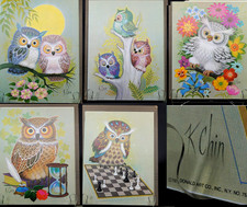 Vintage 1973 Mid Century Modern Litho Prints - Owls By K Chin 9"x12" Set Of 5