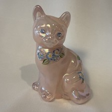 VTG Fenton Pink Iridescent Art Glass Cat Figurine Hand Painted Flowers Signed