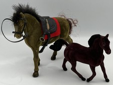 Set of 2 Vintage Flocked Toy Horses w/ Saddles Bridles VGC