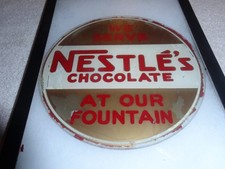 VINTAGE ANTIQUE ORIGINAL "NESTLE'S CHOCOLATE AT OUR FOUNTAIN" 7" GLASS SODA SIGN