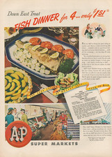 1945 A&P Super Markets Fish Dinner for 4 Only $1.51 Menu Baked Vintage Print Ad