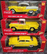 3 Coca-Cola 1955 Chevy Bel Air, Stepside Pickup, 1949 Mercury Coupe Die-Cast Car