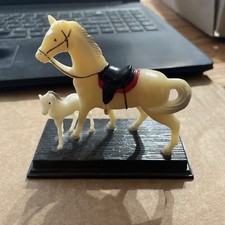 Vtg Plastic Tan Horse W Saddle & Foal On A Base Details 3 1/4” Vintage Horse Toy
