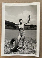 Vintage PHOTO Young Girl / Lady Swimsuit Lake Standing on Toy Floaty Innertube