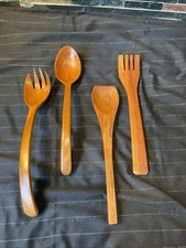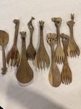 Vintage Hand-Carved Wooden Animals Salad Spoon and Fork Serving Set Lot Antique