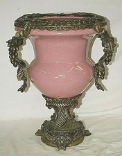 Ornate Ceramic Pink Urn Vase w Resin Grape Cluster Handles & Floral Footed Base