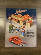 Uncommon Embossed Metal Schuco Toy Car Factory Advertising Sign 19.5x15.5”