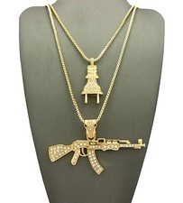 Pave Power Plug, AK47 Gun Pendant 20",24",30" Box Chain Hip Hop 2 Necklace Set