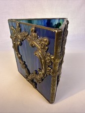 Vintage Blue Slag Glass Trinket Box Triangular Mirrored Bottom Brass Accents