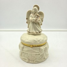 Vintage Ceramic Angel Harp Music Trinket Box Gold Trim Hinged Lid 7.5”
