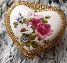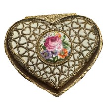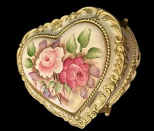 VTG Antique Heart Porcelain Rose Cameo Metal Music Trinket Box Keepsake Rings