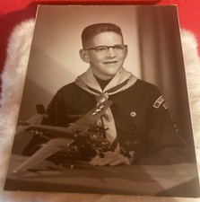 Vintage 11" x 14" 1950'S PORTRAIT OF BOY SCOUT WITH LARGE TOY DISPLAY AIRPLANE!