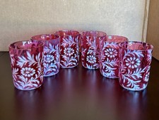 Antique Set Of 6, Fenton Cranberry Opalescent Glasses, 3 3/4”, Fern & Daisy