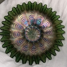 Gorgeous Fenton Green Iridescent Carnival Glass Peacock Bowl Ribbon Ruffled Edge