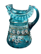 Antique Victorian Fenton Blue Daisy Glass Hand Painted Daisy Ruffled Pitcher