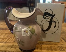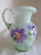 Fenton Art Glass Collectible Opaline Green Pitcher w/Purple Flowers NICE!