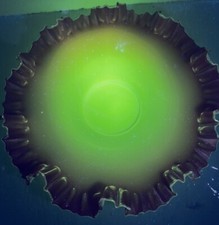 Fenton Uranium Art Glass Crimped Bride's Bowl Custard/Green/Plum 10 x 9 x 3 1/4