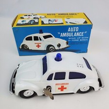 Vintage toy car Volkswagon VW Beetle Auto Ambulance wind up car siren w/ Box