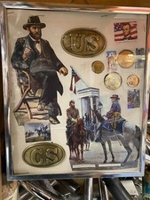 Antique Civil War Belt buckle Tokens Coins Money display Framed Lot Pictures Lee