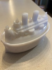 Antique CL Flaccid Wh. Milk Glass Battleship Boat Covered Mustard Dish 1898 6x4