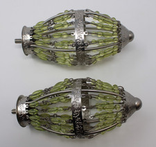 Vtg Beaded Lamp Finials Pair Chartreuse Green Beads Metal Cage 5.5" Mid-Century