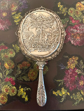 Antique Art Nouveau Silverplate Repousse Hand Mirror Cherub Cupid Arrows Mirror